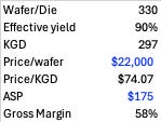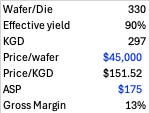 At $45,000 per wafer that goes to a decidedly not reasonable 5% gross margin.