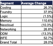 Looking at all those by segment, the comparison with a wave is clear. Spending on memory hit last year, as did spending to ease the capacity at fabs as evidenced by the Wafer Fabrication Equipment (WFE) spend. Logic traded sideways – as we noted many of those companies are maxed out on capacity.