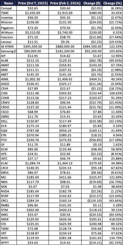 We cautioned that not all of these would do well, but at least we got the memory and storage names on there. We should also point out that we forgot to add Corning, which has done very well – all that AI is going to need a lot of optical fibers.