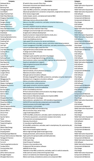 Hubble is Huawei’s venture capital arm. In 2021, a contact in Shenzhen sent us the list of Hubble Capital’s portfolio companies. That list had ten names on it. Below we have a more recent list, from 2024 with Hubble’s portfolio companies. This list has 74 names on it, and we are fairly certain that it is missing a lot of Hubble’s investments. We have heard reliable estimates that puts Hubble’s portfolio at 200-300 investments. Huawei founded Hubble in 2019 just as US sanctions began, with a clear goal of developing workarounds for those sanctions, and it looks like its scope has widened with each successive round of restrictions.