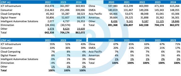 Huawei’s operating segments are a bit more interesting. Here we can see the company is still heavily reliant on domestic sales, a figure which actually fell during the downturn but has now resurged. We can also see the growth of the company’s auto business which is up 13x in just two years.