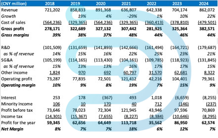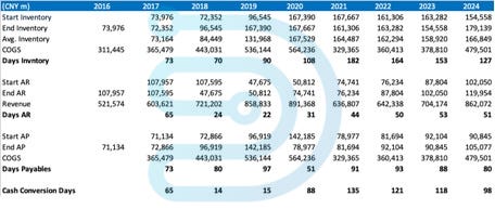 We can see the impact of the US sanctions through these numbers, with revenue declining almost 30% in 2021, only to recover to RMB 864 billion (US$121 billion) in 2024. Gross margins of 44% are not terribly exciting but better than many of its peers in the equipment markets that were once its core business. The company widely touts its heavy R&D expense, demonstrating how much it spends on innovation. At 21% of 2024 revenue that figure is higher than many companies, but not by an order of magnitude. Nor are its operating and net margins particularly eye-catching. Its balance sheet and working capital metrics, printed below, tell a similar story. The downturn is clear, but the company has largely worked through the worst of it.